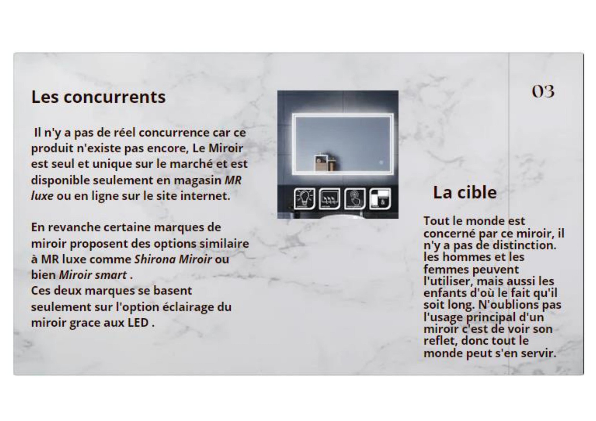 Après avoir réalisé un questionnaire que j'ai partagé sur un réseau social, j'ai constaté que les personnes intéressées par le produit avaient généralement le même âge. Alors j'ai fait en sorte que le projet. vise principalement une population intergénérationnelle de 13 à 70 ans, qui accorde de l'importance à son apparence physique. Notre positionnement sur le marché était unique, car nous offrions un produit révolutionnaire, avec peu de concurrence à part un autre miroir connecté. J'ai appliqué mes connaissances et mon imagination pour créer ce produit, ce qui m'a permis de comprendre le rôle d'un technico-commercial. La réalisation de ce travail n'a pas été difficile, car nous avions la liberté de définir nos propres cibles. Cependant, j'aurais pu améliorer ma communication et approfondir certaines notions abordées en cours.